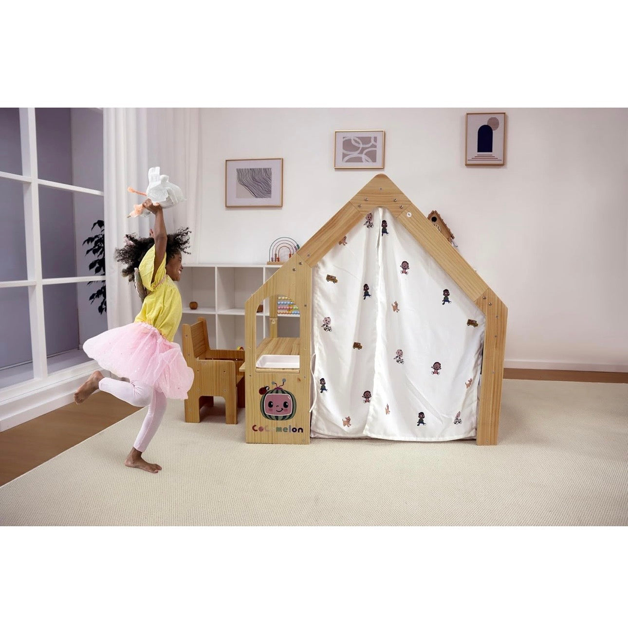Su diseño moderno se integra con armonía en salas de juego, dormitorios o espacios comunes del hogar. Es una pieza versátil que puede funcionar como casa de juegos, rincón creativo o espacio de estudio infantil.