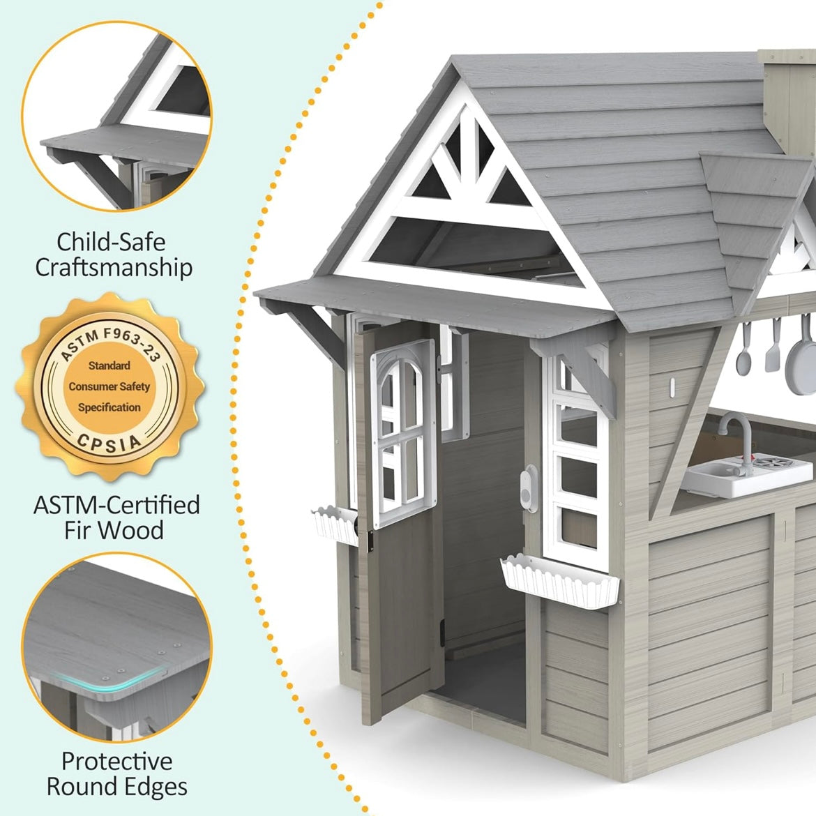 Fabricada con madera de alta calidad, esta casa de juegos ofrece una textura natural, resistencia superior y una larga vida útil. Su estructura sólida y estable está diseñada para soportar el juego activo de varios niños, brindando seguridad y tranquilidad a los padres.
