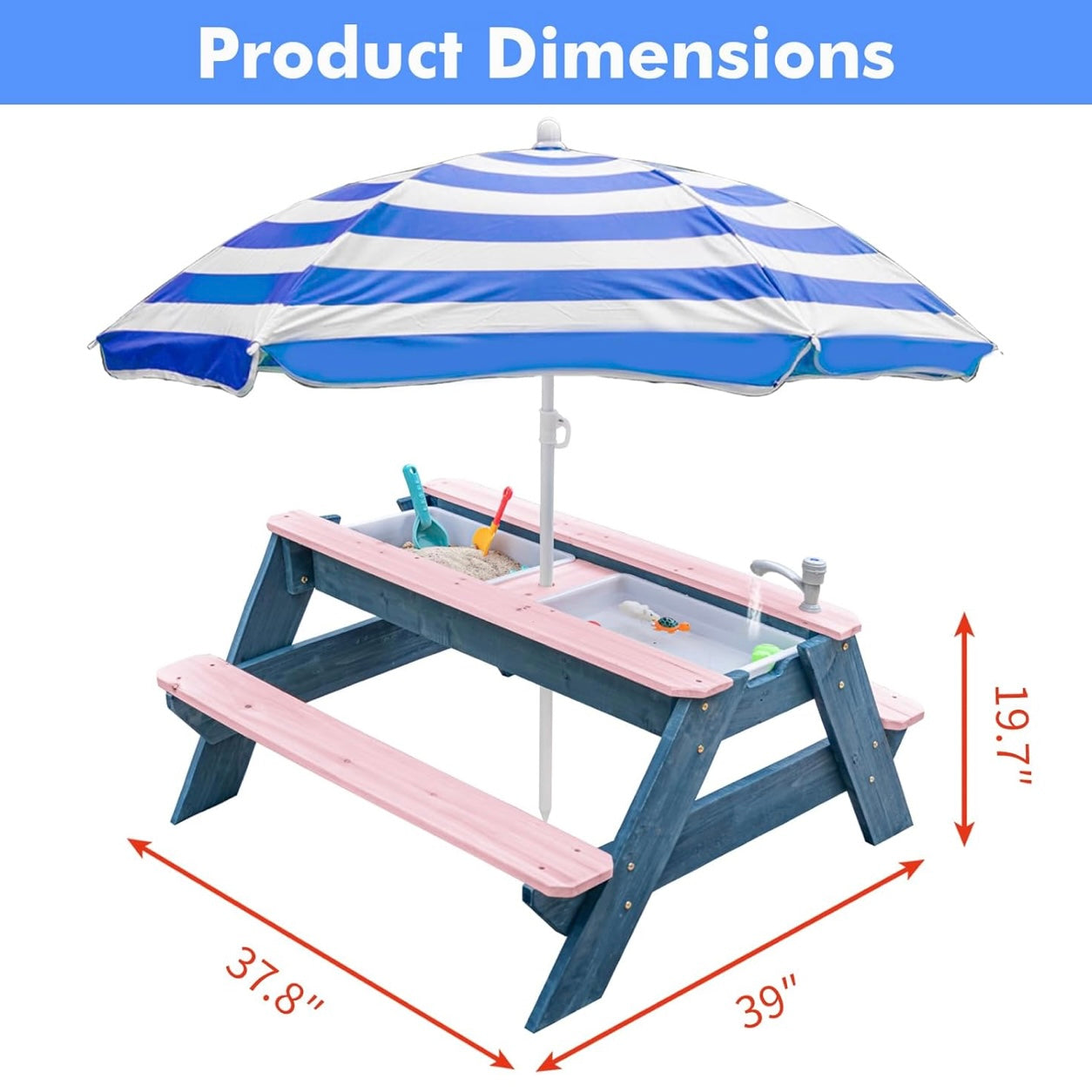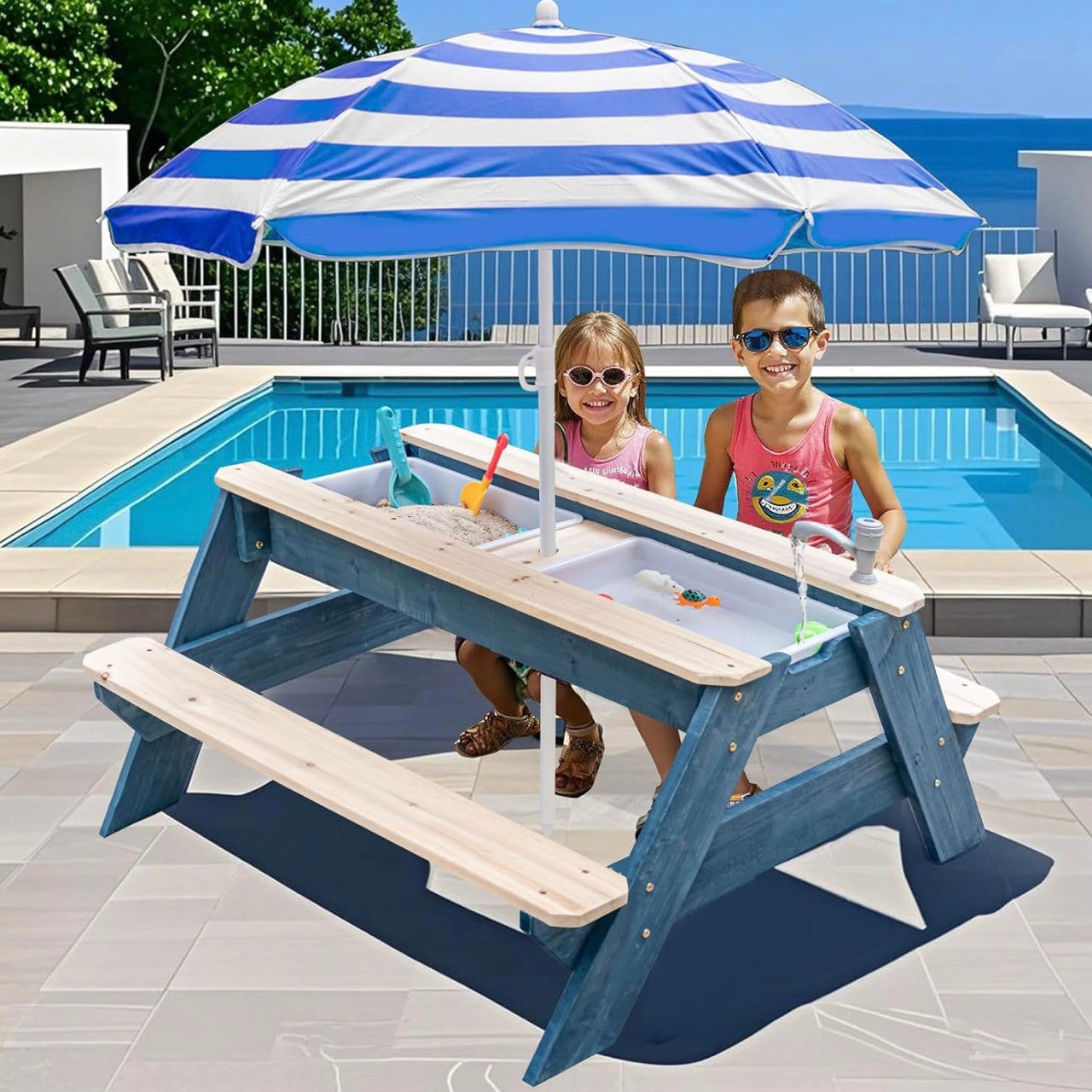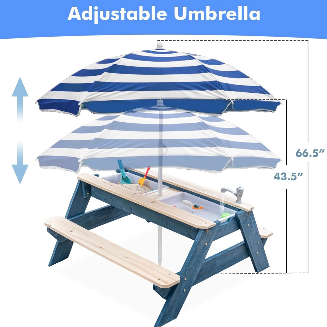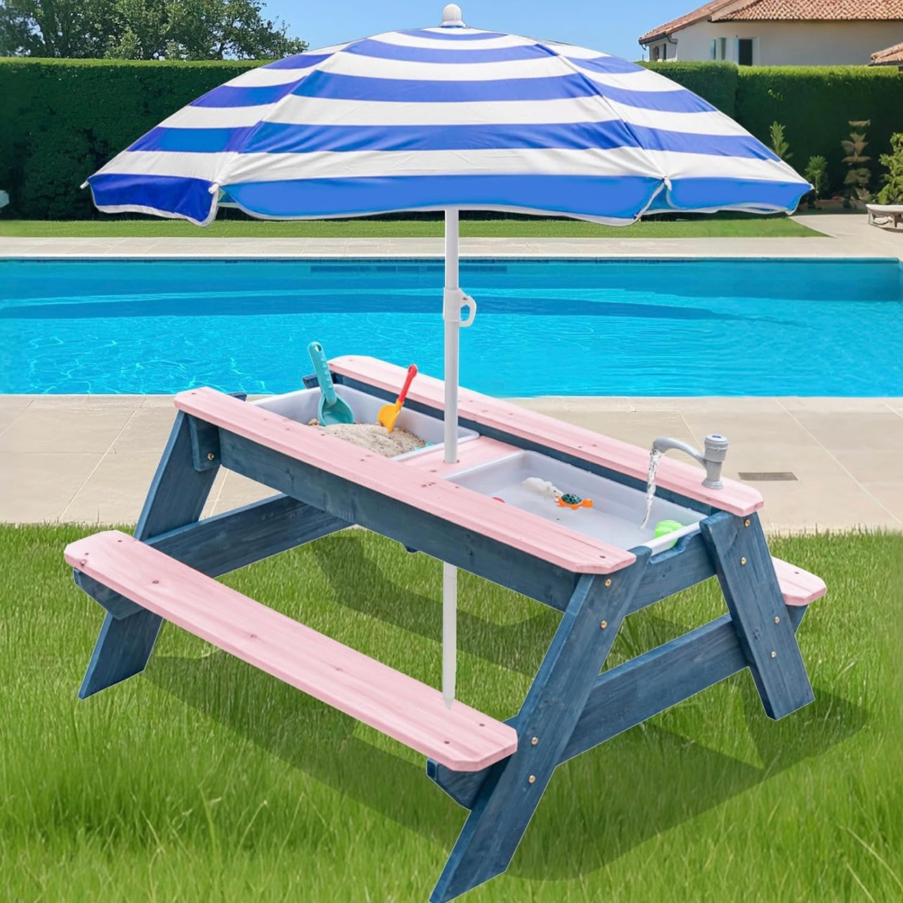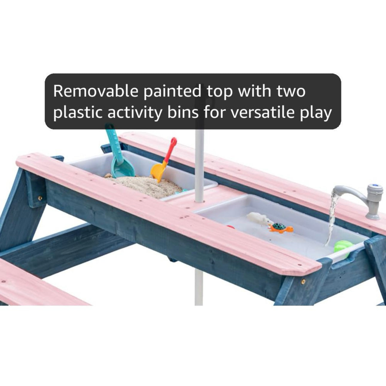 Esta mesa de madera se transforma con solo levantar la tapa: es comedor, estación de arena, juego de agua y escenario para imaginación sin límites. Con dos contenedores ocultos y un paraguas ajustable, acompaña tardes soleadas de castillos, barquitos, meriendas y grandes historias.