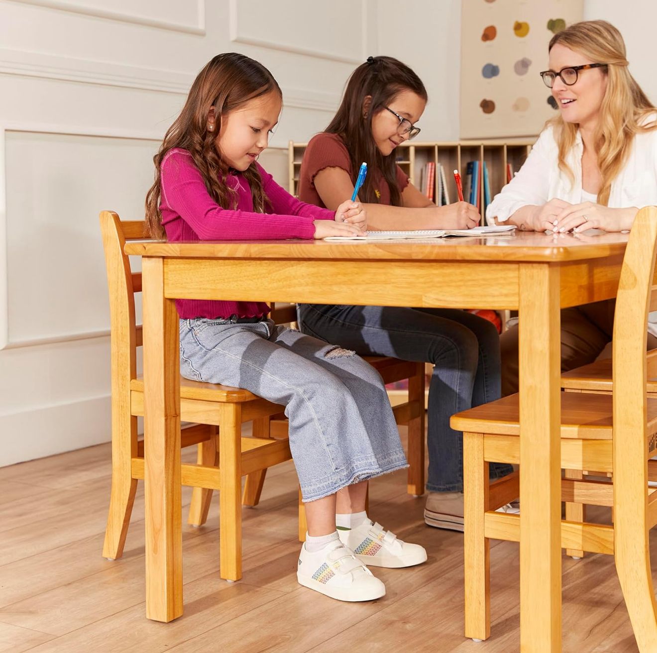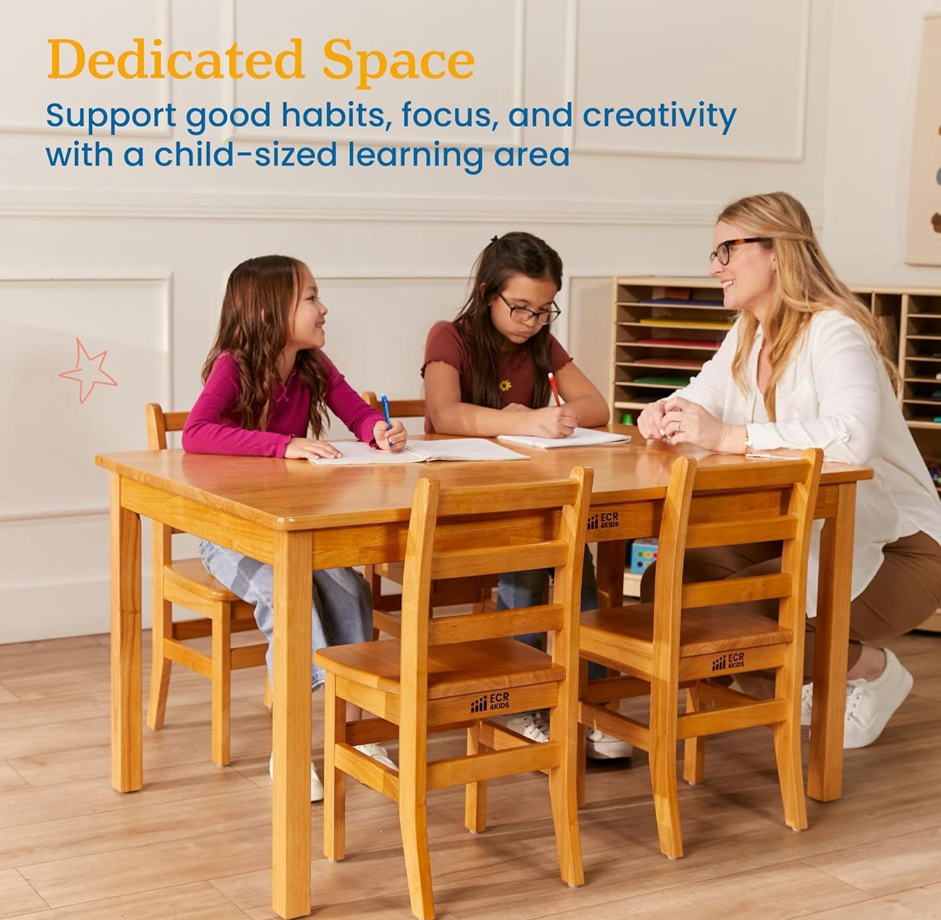 - Mesa y sillas de madera dura: Mantenga a los niños pequeños cómodos durante las actividades sentadas en el hogar o en el aula con la mesa de madera y el paquete de 4 sillas de madera para crear un área de aprendizaje dedicada