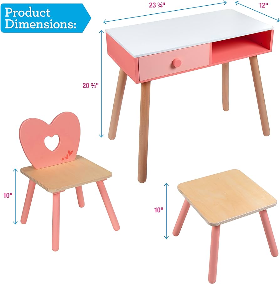 - Para mayores de 3 años, adecuado para edades de 3 a 10 años. El escritorio mide 23.75 pulgadas de largo, 12 pulgadas de ancho y 20.75 pulgadas de alto. Los asientos miden 10 pulgadas de alto (sin respaldo, del piso al asiento).