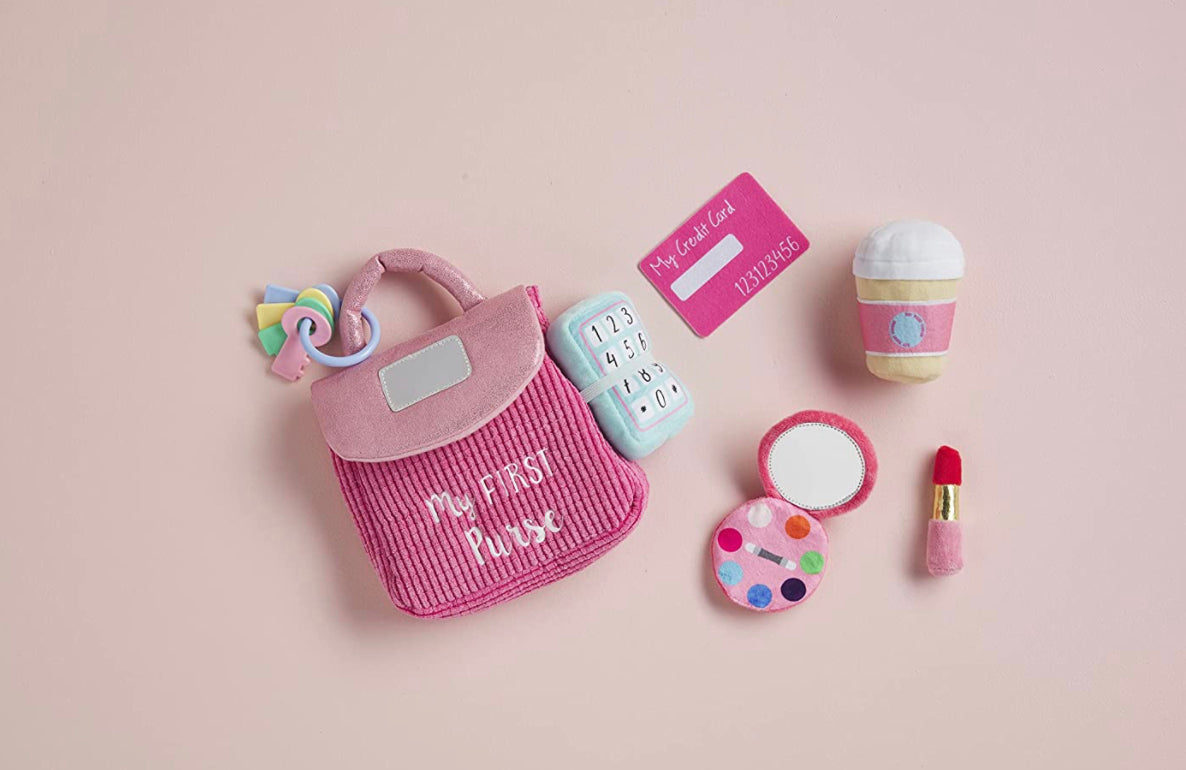 - Juego de 7 piezas. El bolso de juego de felpa viene con seis accesorios familiares: espejo seguro para bebé, juego de llaves, maquillaje compacto, tarjeta de crédito, lápiz labial de felpa, taza de café con sonajero y teléfono de felpa con efecto de sonido de timbre.