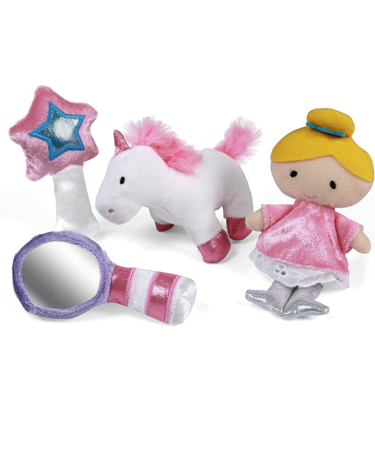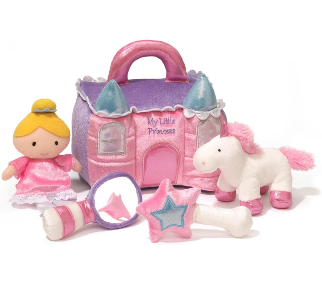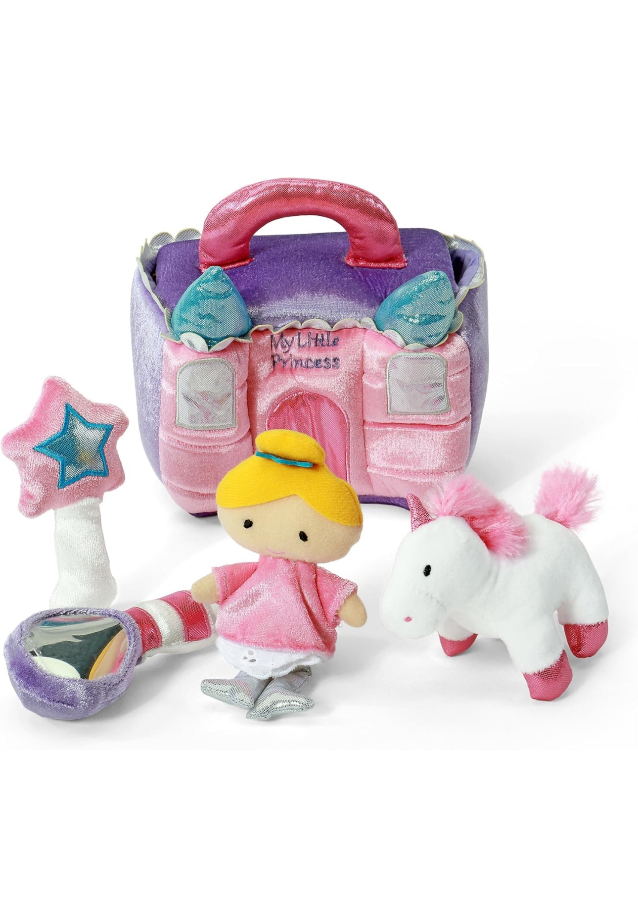 - LA PRINCESA MÁS BONITA DEL CASTILLO: este conjunto de cinco piezas incluye una muñeca de princesa que cruje, un espejo mágico, un sonajero de varita y un unicornio de juguete con sonido dentro de la bolsa de transporte con forma de castillo rosa brillante.