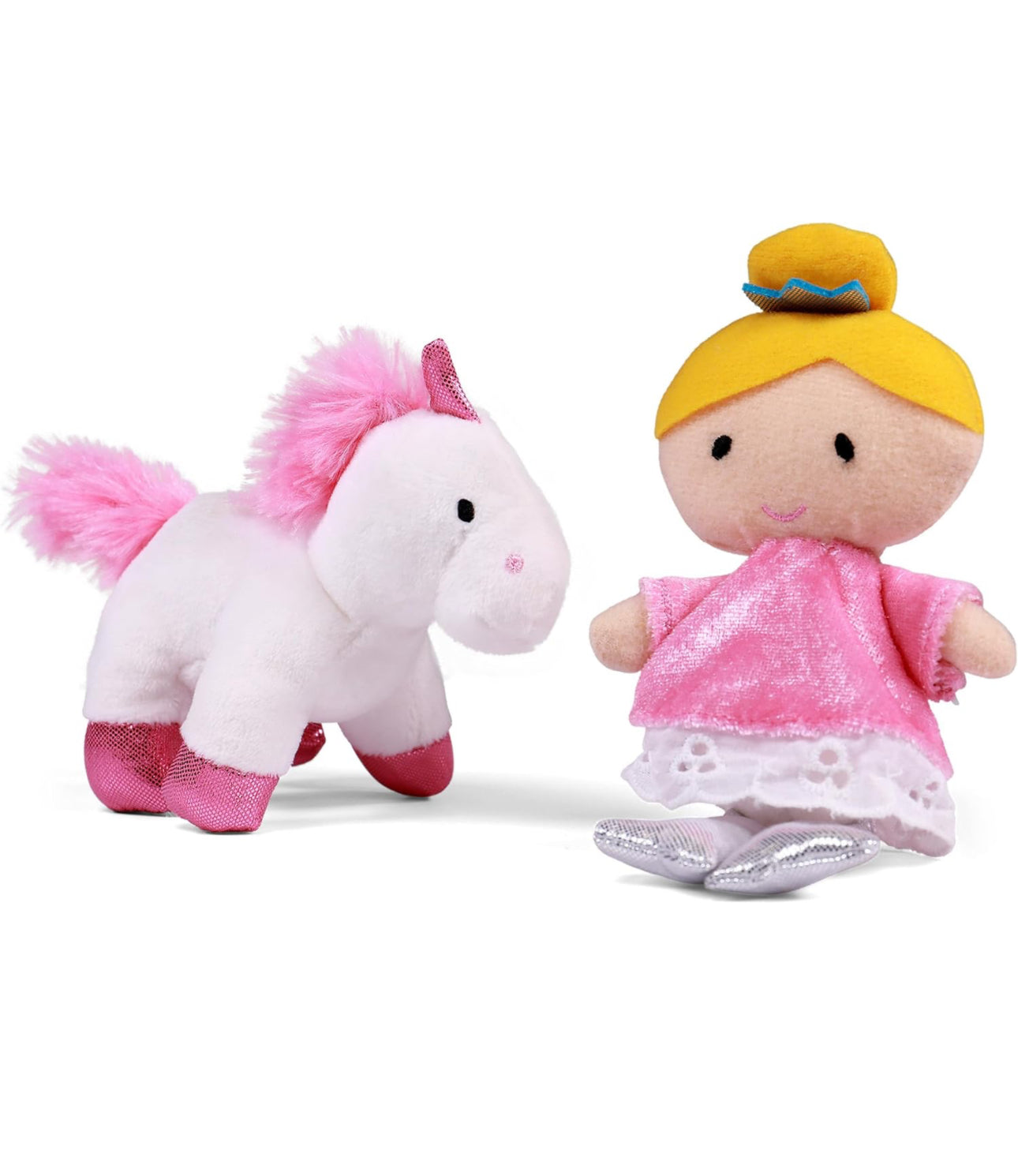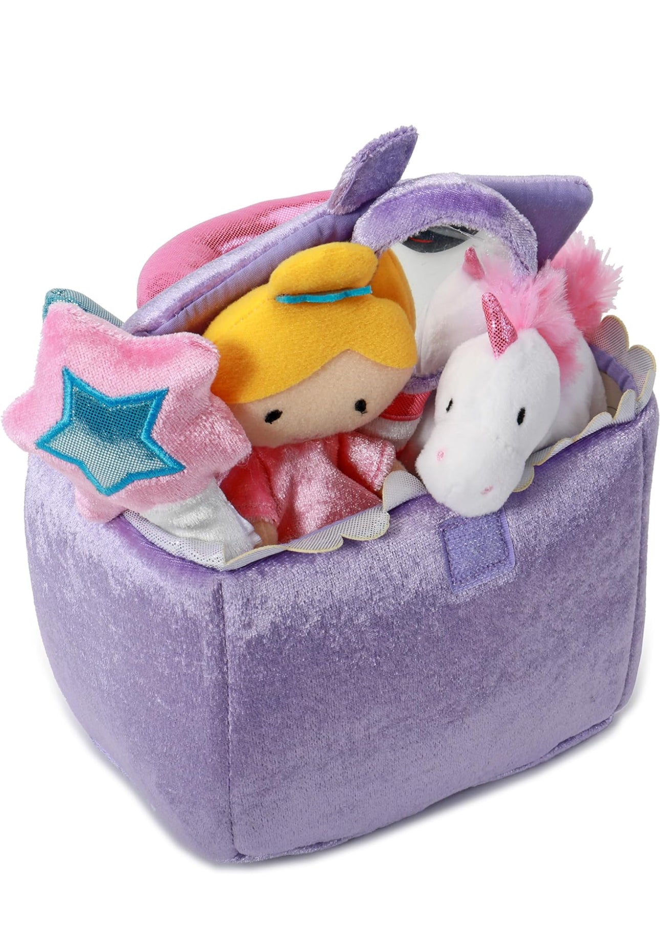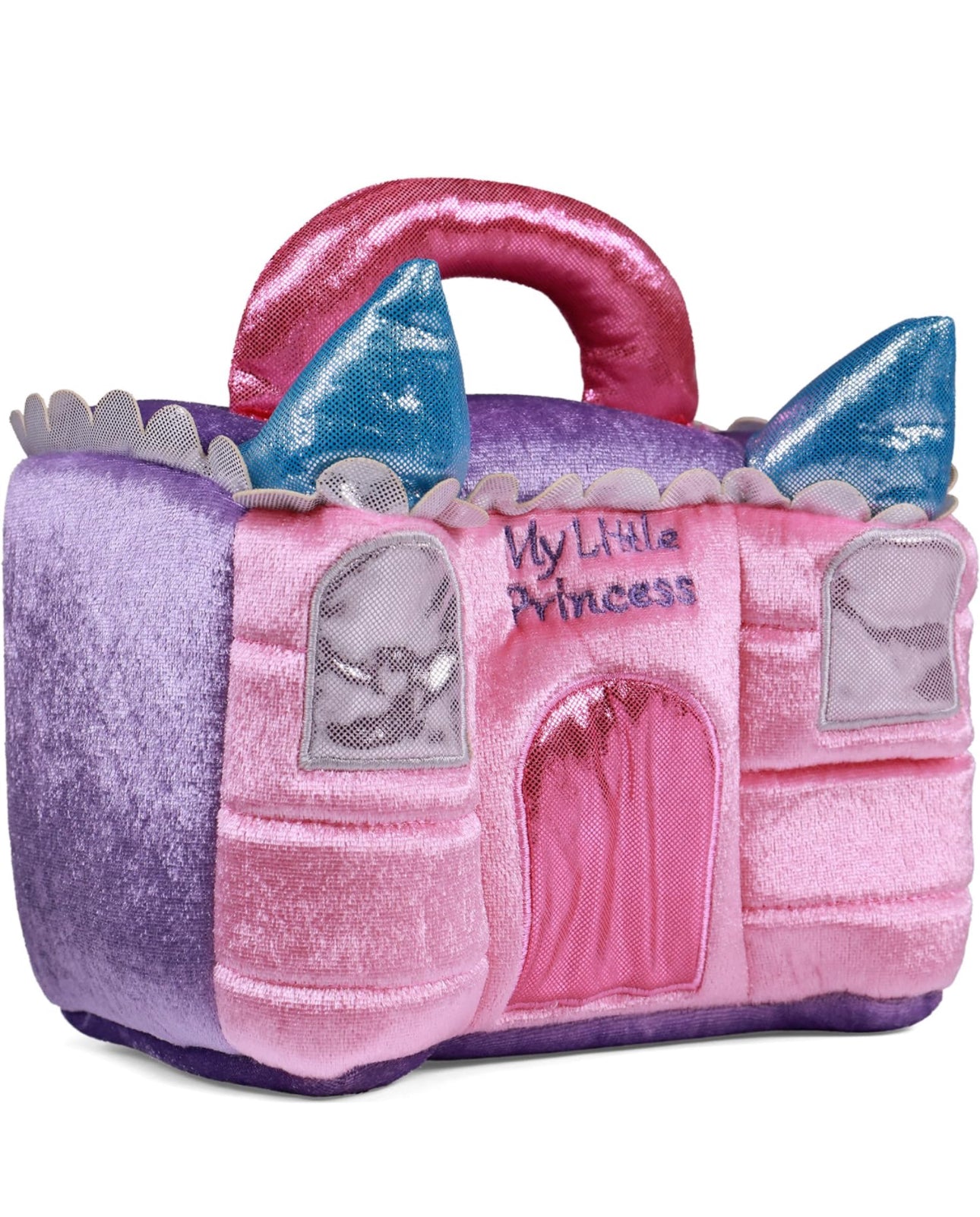 - LA PRINCESA MÁS BONITA DEL CASTILLO: este conjunto de cinco piezas incluye una muñeca de princesa que cruje, un espejo mágico, un sonajero de varita y un unicornio de juguete con sonido dentro de la bolsa de transporte con forma de castillo rosa brillante.