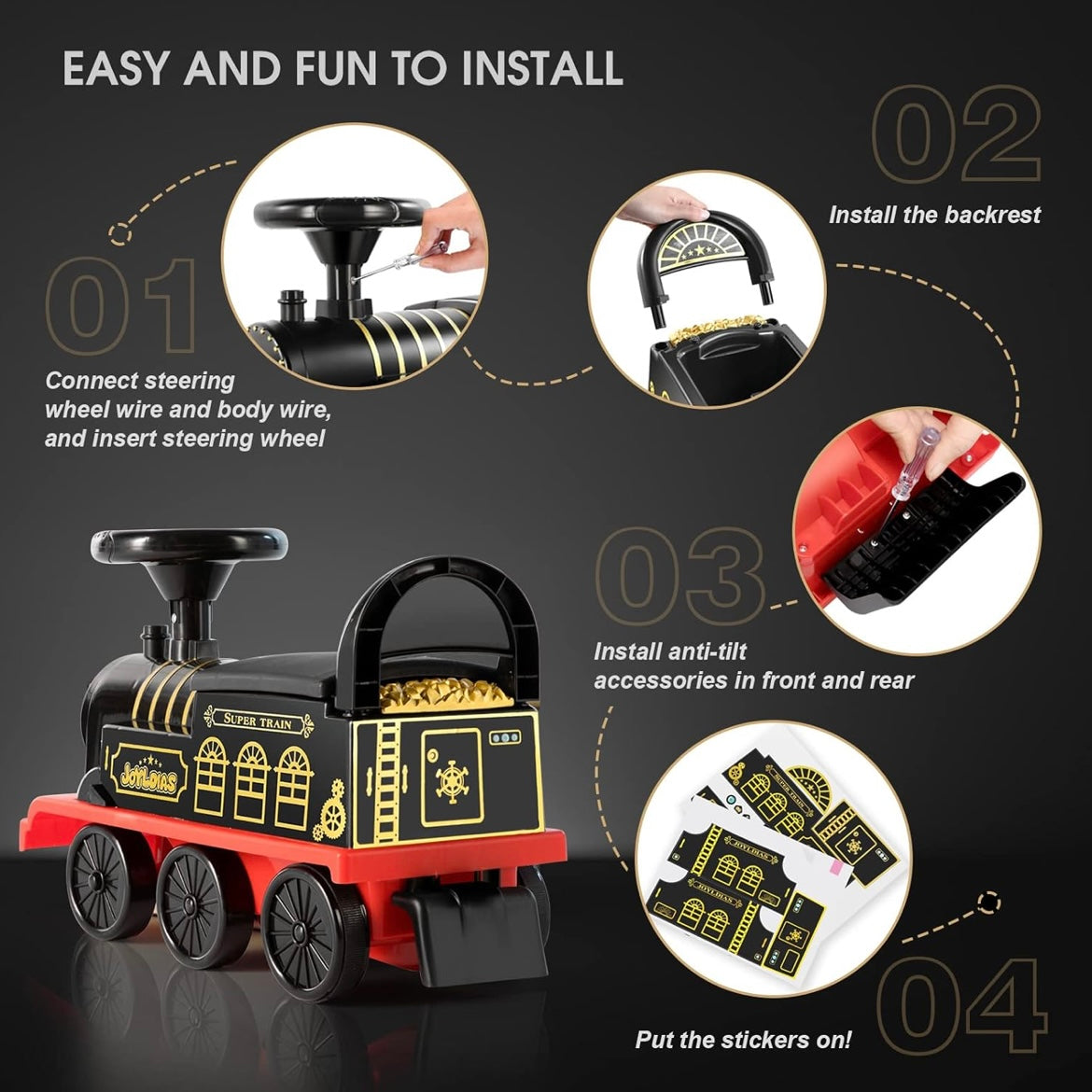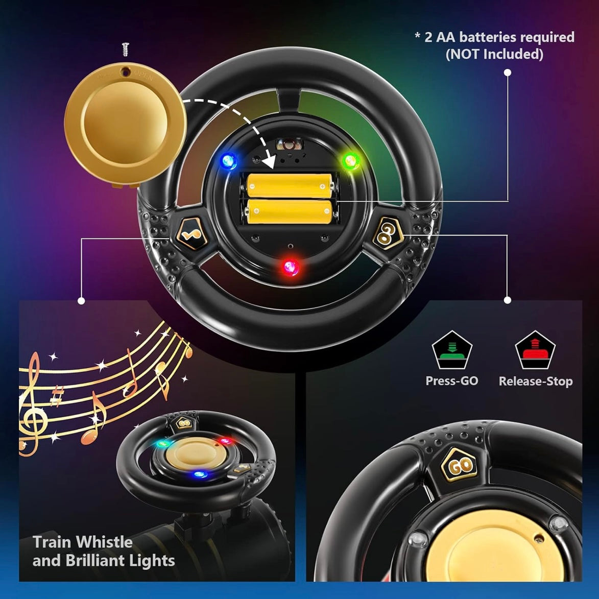 El manejo es sencillo e intuitivo: los niños pueden encenderlo con un interruptor, girar y detener el tren usando el volante, mientras disfrutan de luces intermitentes de tres colores y sonido de silbato, creando una experiencia de juego inmersiva y emocionante.