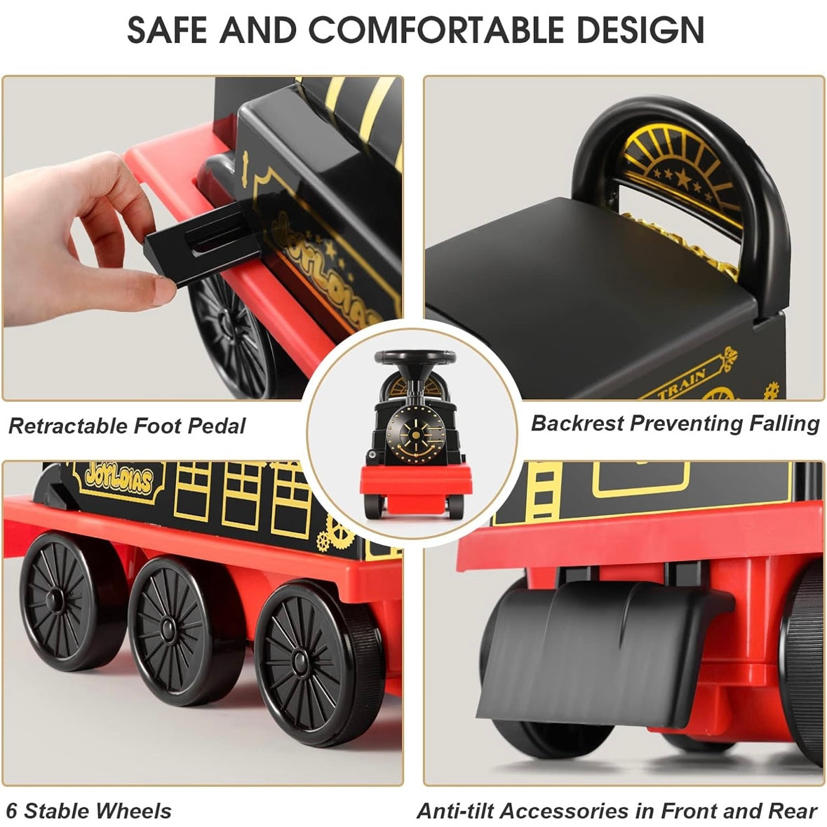 Gracias a sus reposapiés retráctiles, este tren no solo funciona como juguete de paseo, sino que también puede utilizarse como andador, acompañando el desarrollo motriz del niño. Incorpora un compartimento de almacenamiento oculto debajo del asiento, ideal para guardar juguetes o snacks sin alterar su diseño aerodinámico.