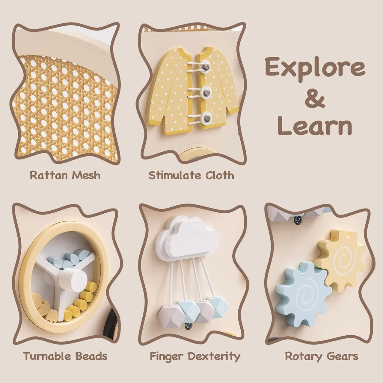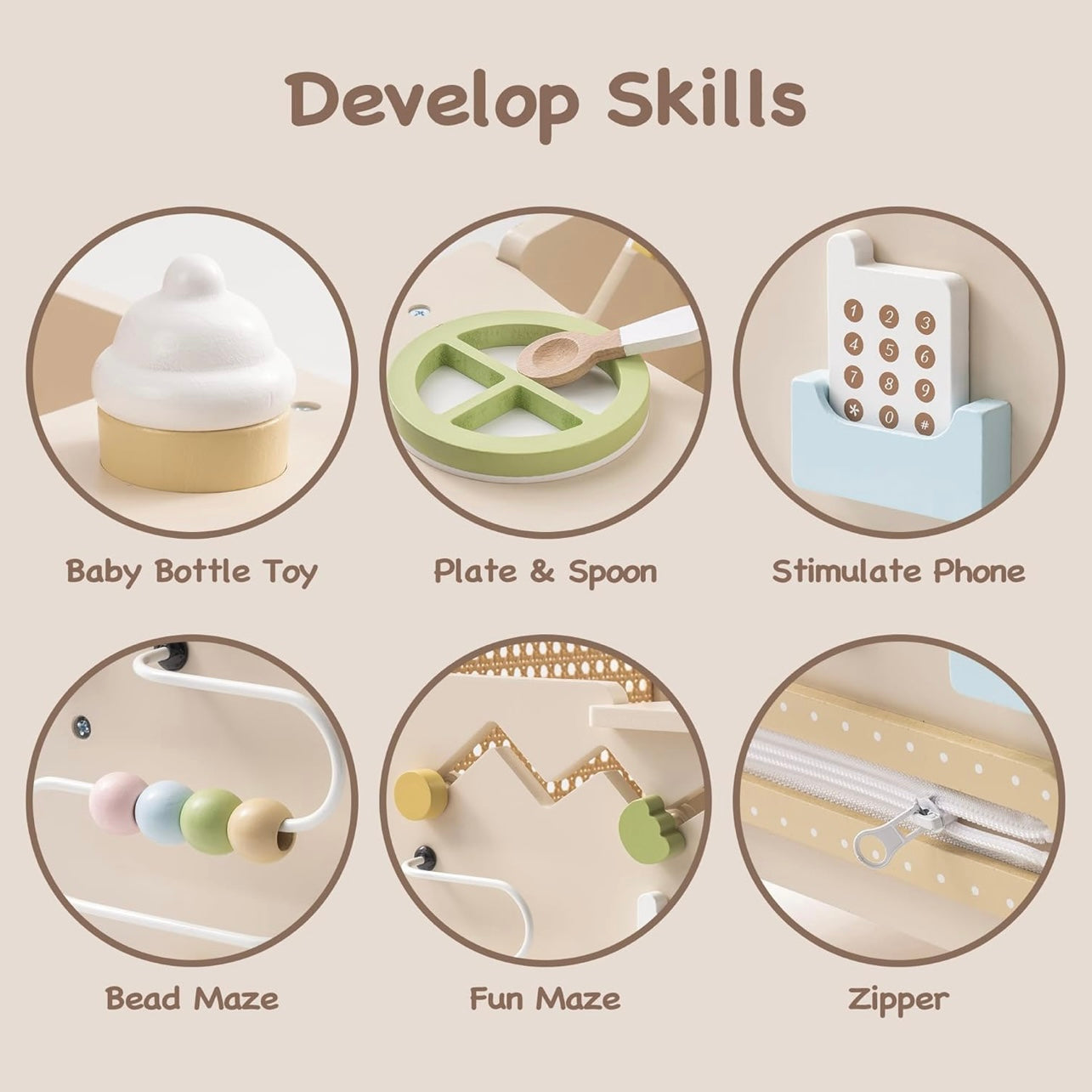 Cada lado guarda descubrimientos: cremalleras, botones, una lavadora simulada con cuentas y accesorios para alimentar a la muñeca. Un juego que desarrolla autonomía, coordinación y habilidades prácticas con magia infantil.