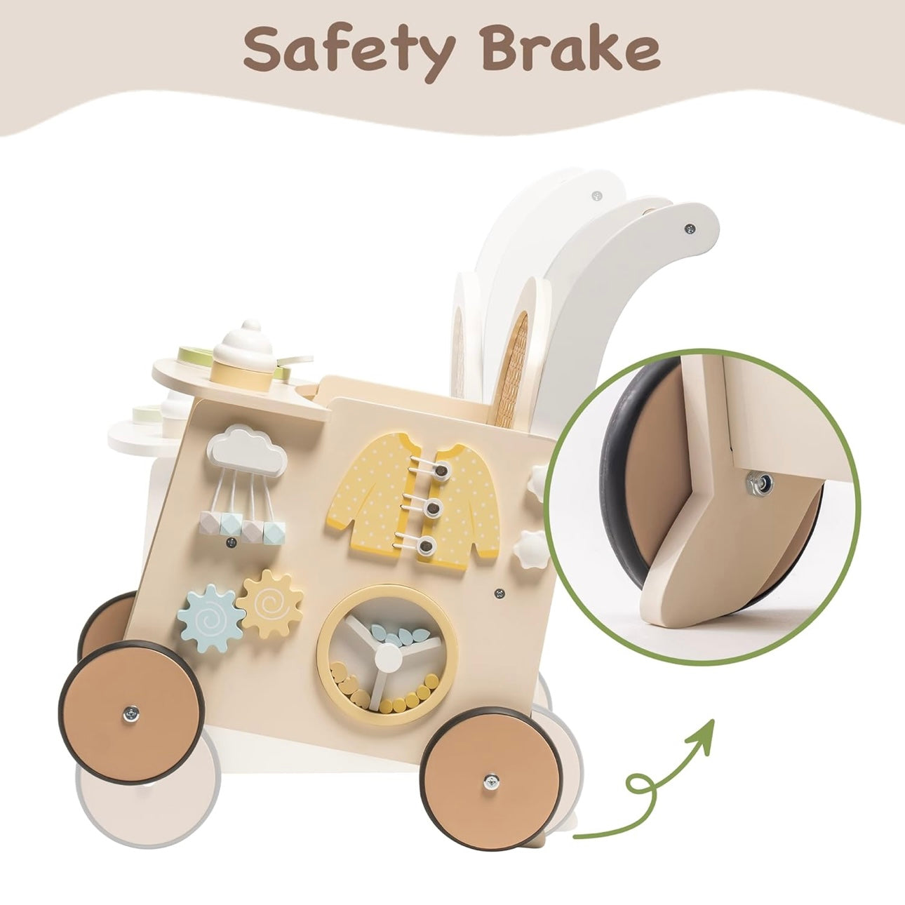 Hecho en madera, con bordes redondeados y freno de seguridad que controla el movimiento, acompañando a tu pequeño a su ritmo, sin prisas y con confianza
