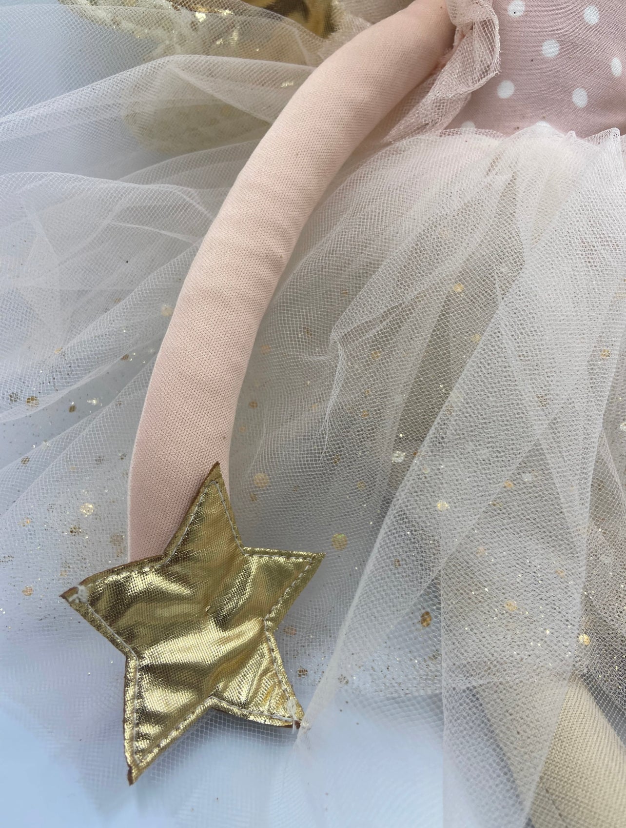 Muñeca 100% hecha a mano, falda de tul, corona, estrella dorada y zapatillas.