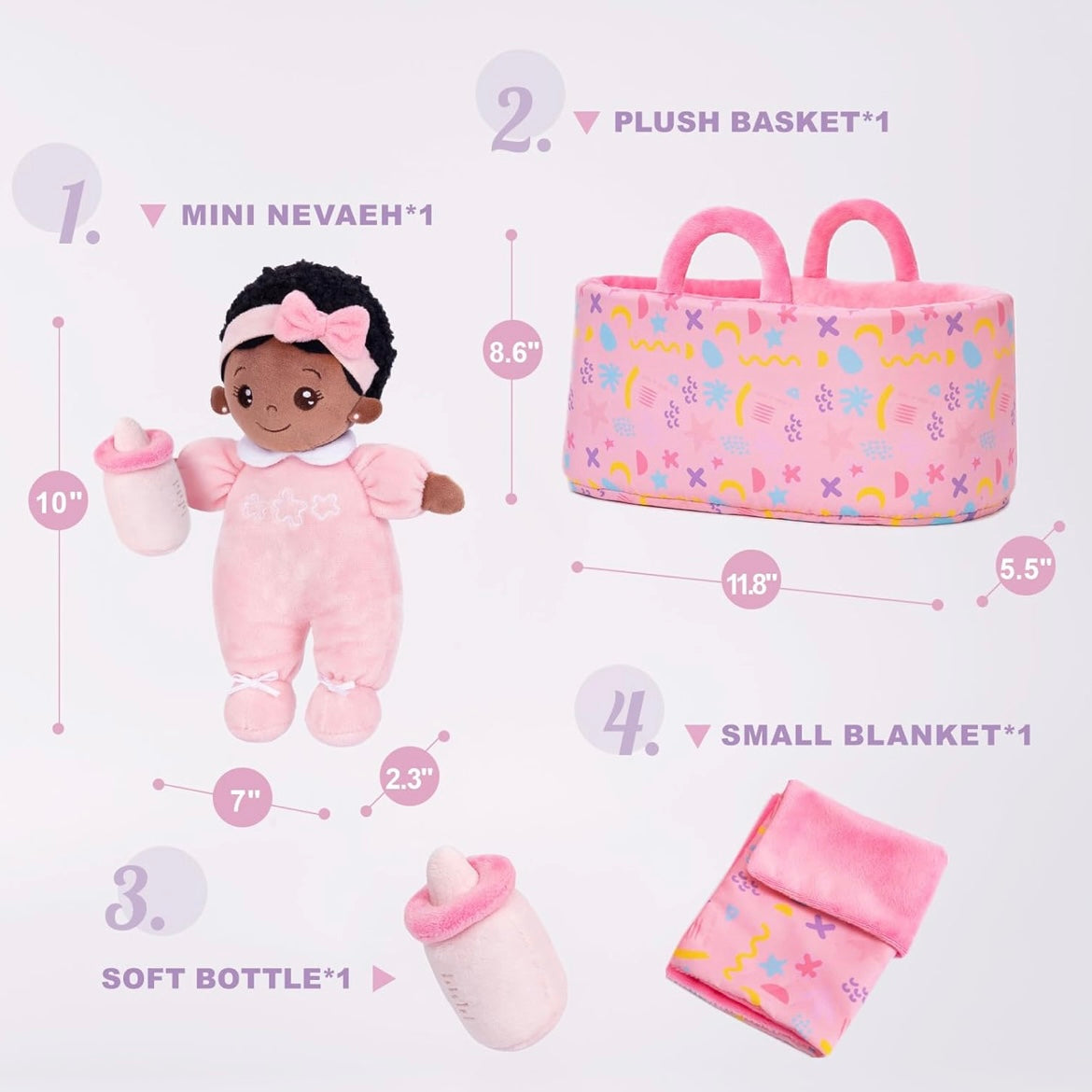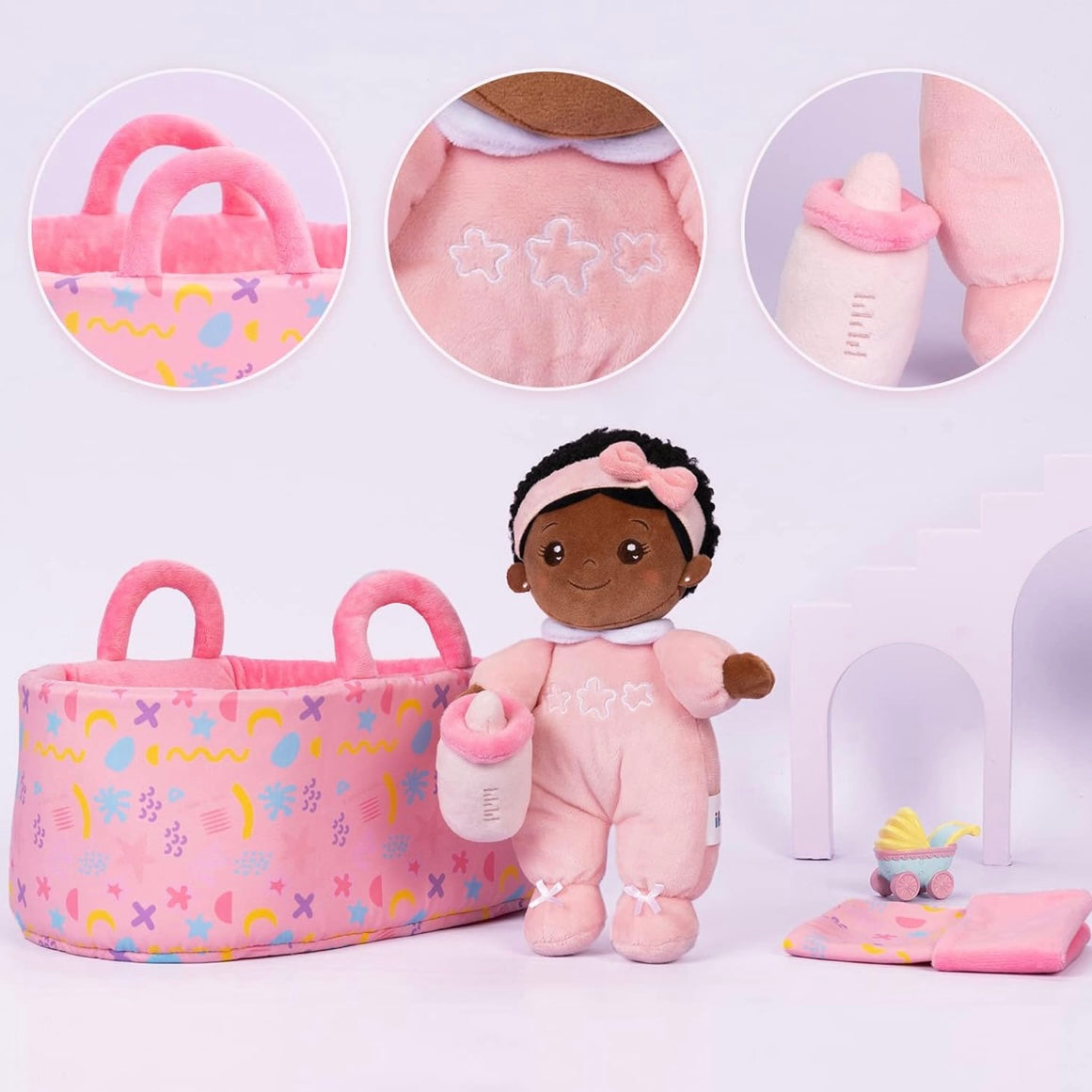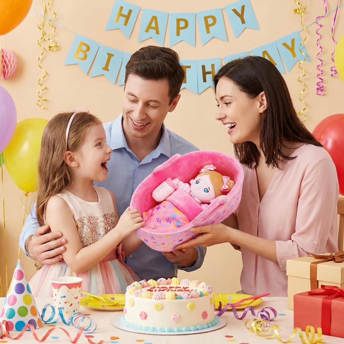 Cada set incluye una muñeca suave, un biberón afelpado, una canasta de tela y una pequeña manta, lo que convierte a estas muñecas en un regalo ideal para cumpleaños, baby showers, Navidad o cualquier ocasión especial. Además, funcionan como un delicado elemento decorativo en la habitación infantil.