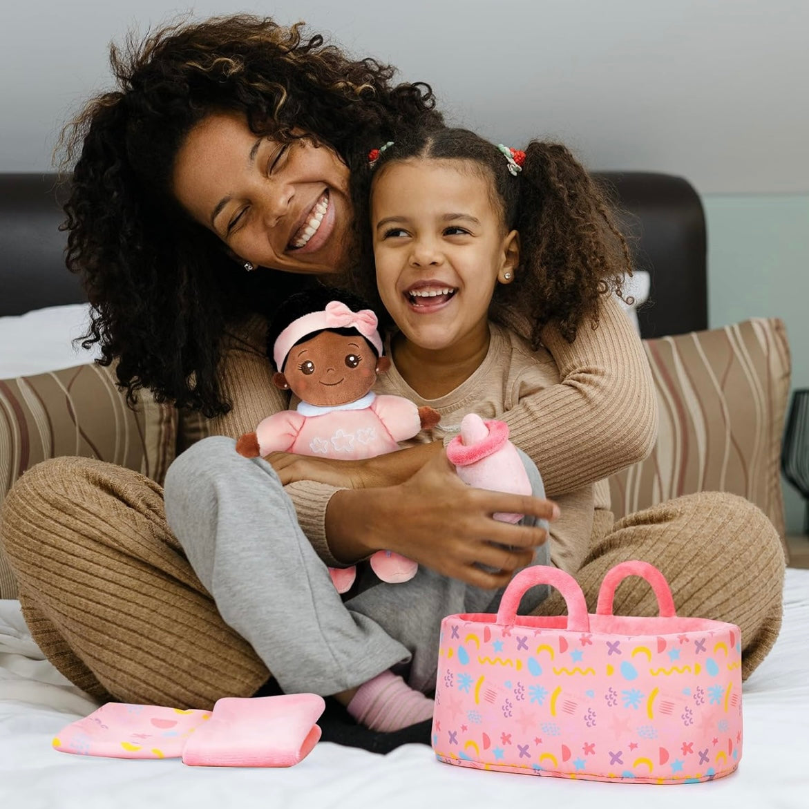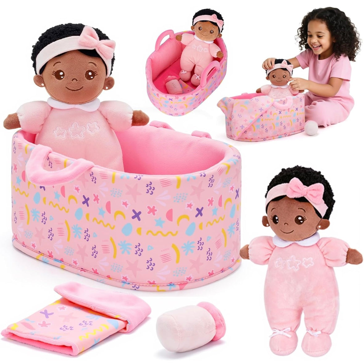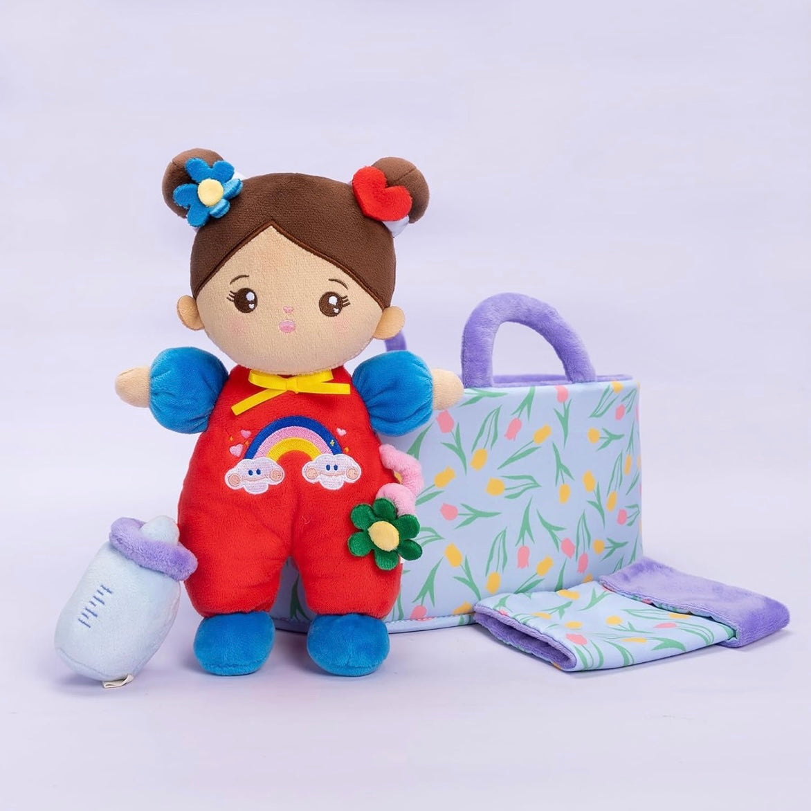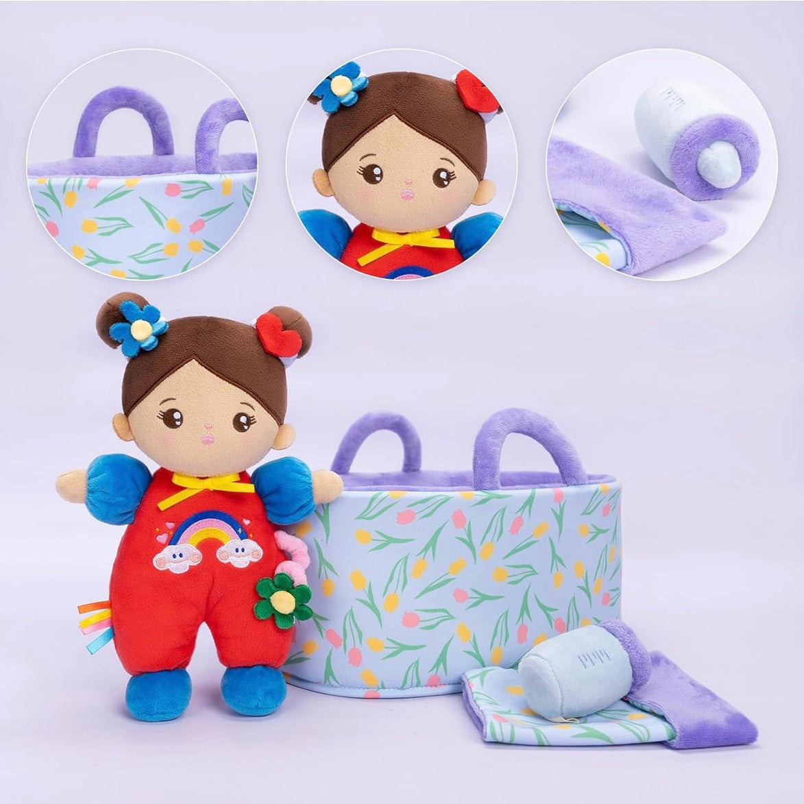 Cada set incluye una muñeca suave, un biberón afelpado, una canasta de tela y una pequeña manta, lo que convierte a estas muñecas en un regalo ideal para cumpleaños, baby showers, Navidad o cualquier ocasión especial. Además, funcionan como un delicado elemento decorativo en la habitación infantil.