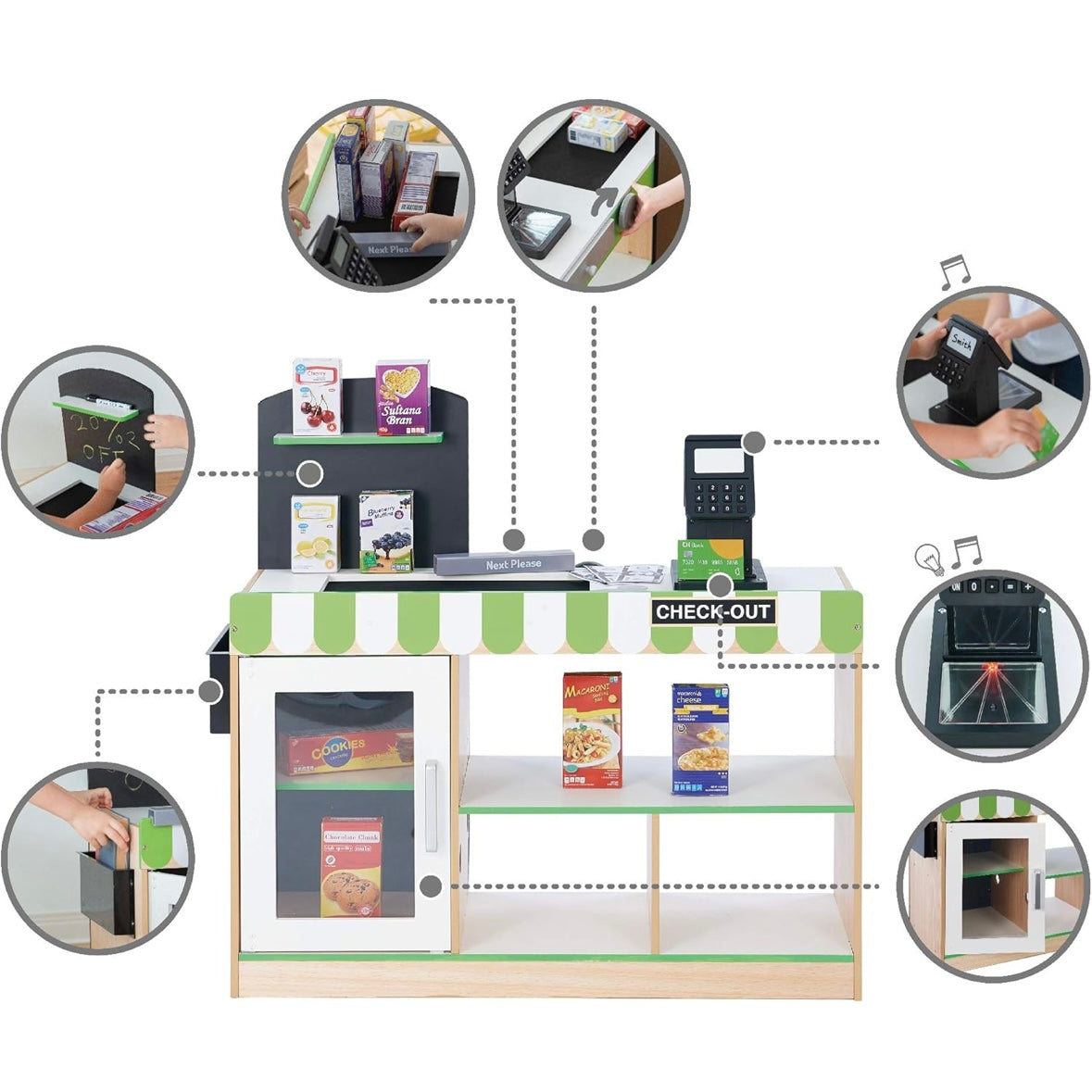 Las funciones interactivas permiten a los niños simular una compra real: deslizar los productos por la cinta transportadora manual, pagar con tarjeta de crédito o dinero y completar la transacción en la caja registradora, fomentando el juego de roles y el aprendizaje práctico.