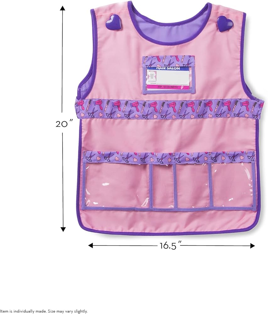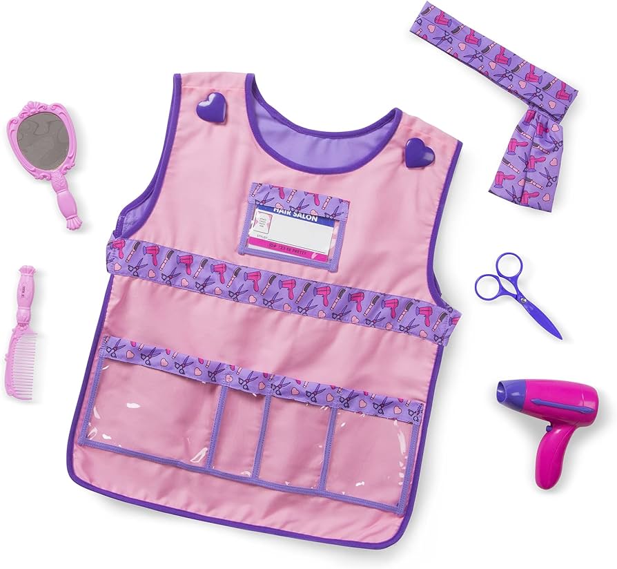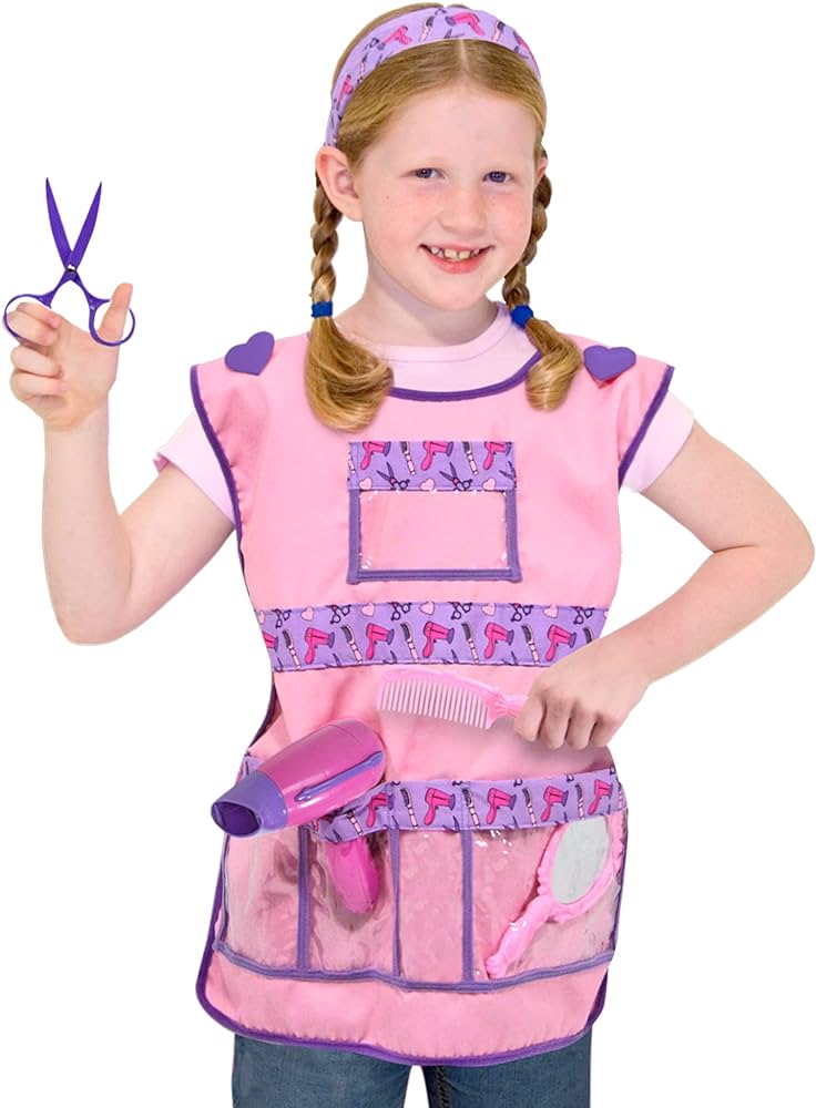 - DISFRAZ DURADERO DE ESTILISTA DE PELUQUERÍA: El set de disfraz para el juego de rol de estilista de peluquería de Melissa & Doug está hecho de materiales de alta calidad para garantizar seguridad y durabilidad. Incluye 7 accesorios que ayudan a los niños a interpretar su papel.