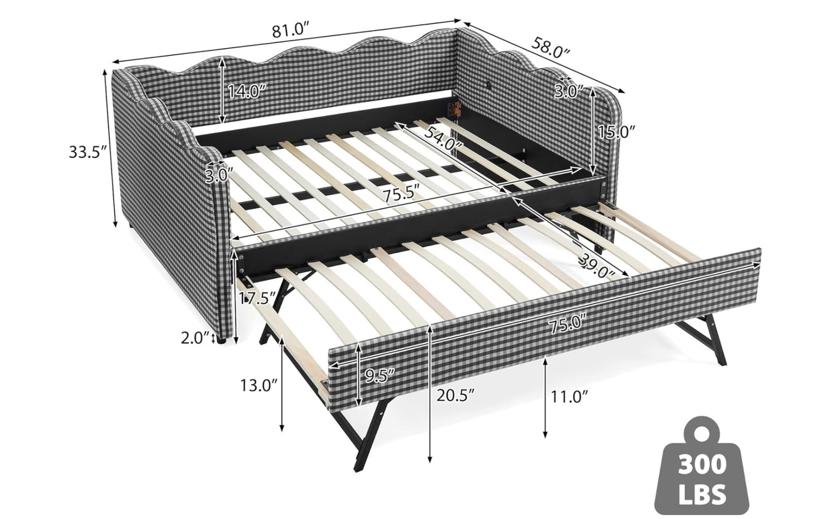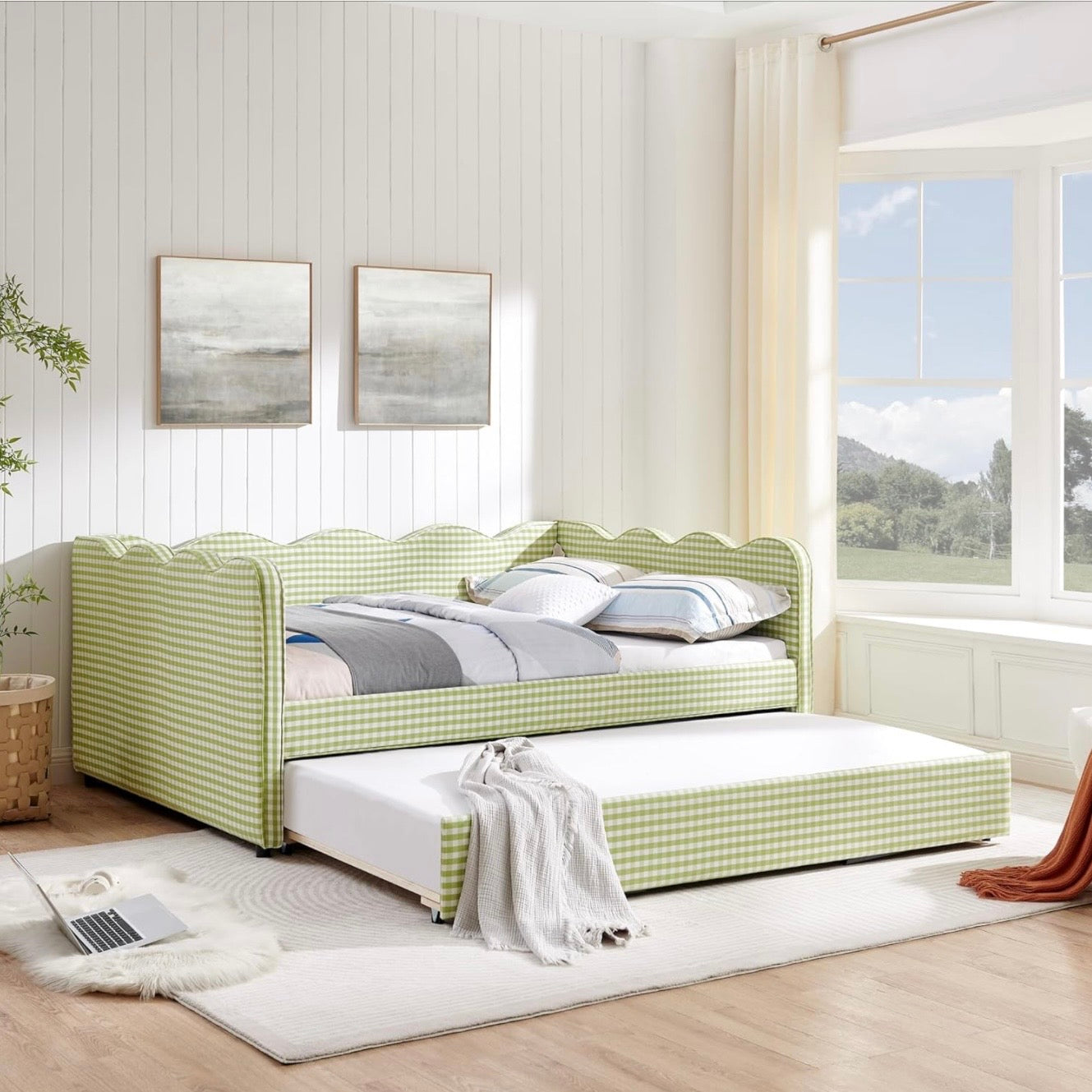 Tapizada en lino suave y transpirable, con relleno de espuma de alta densidad, ofrece una sensación acogedora tanto para dormir como para relajarse durante el día. Su borde ondulado y patrón de cuadros aportan un toque cálido y decorativo que funciona como punto focal en cualquier habitación.